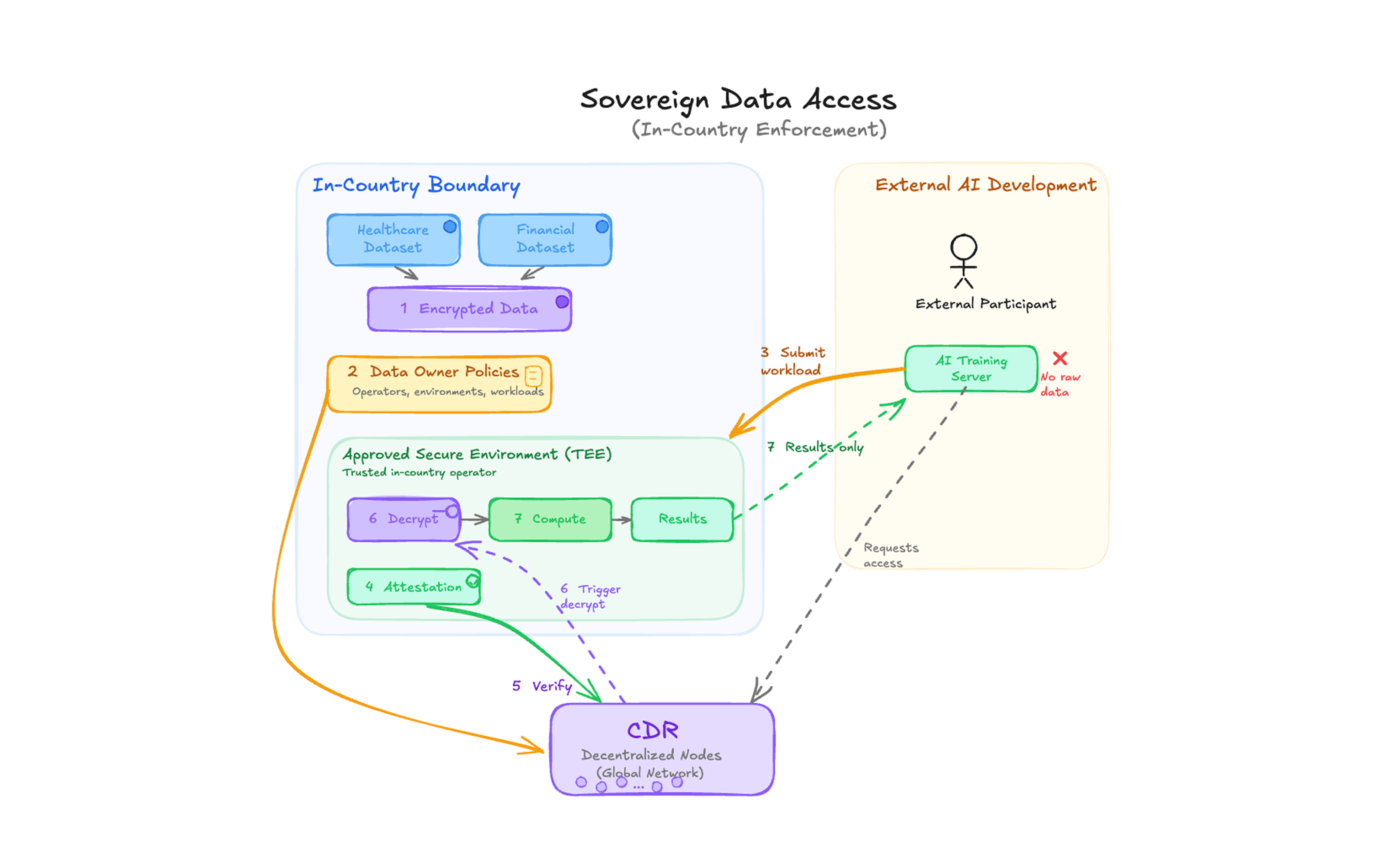 External participants do not receive the raw data. Instead, they submit workloads, such as training jobs or queries, to an approved in-country orchestrator.