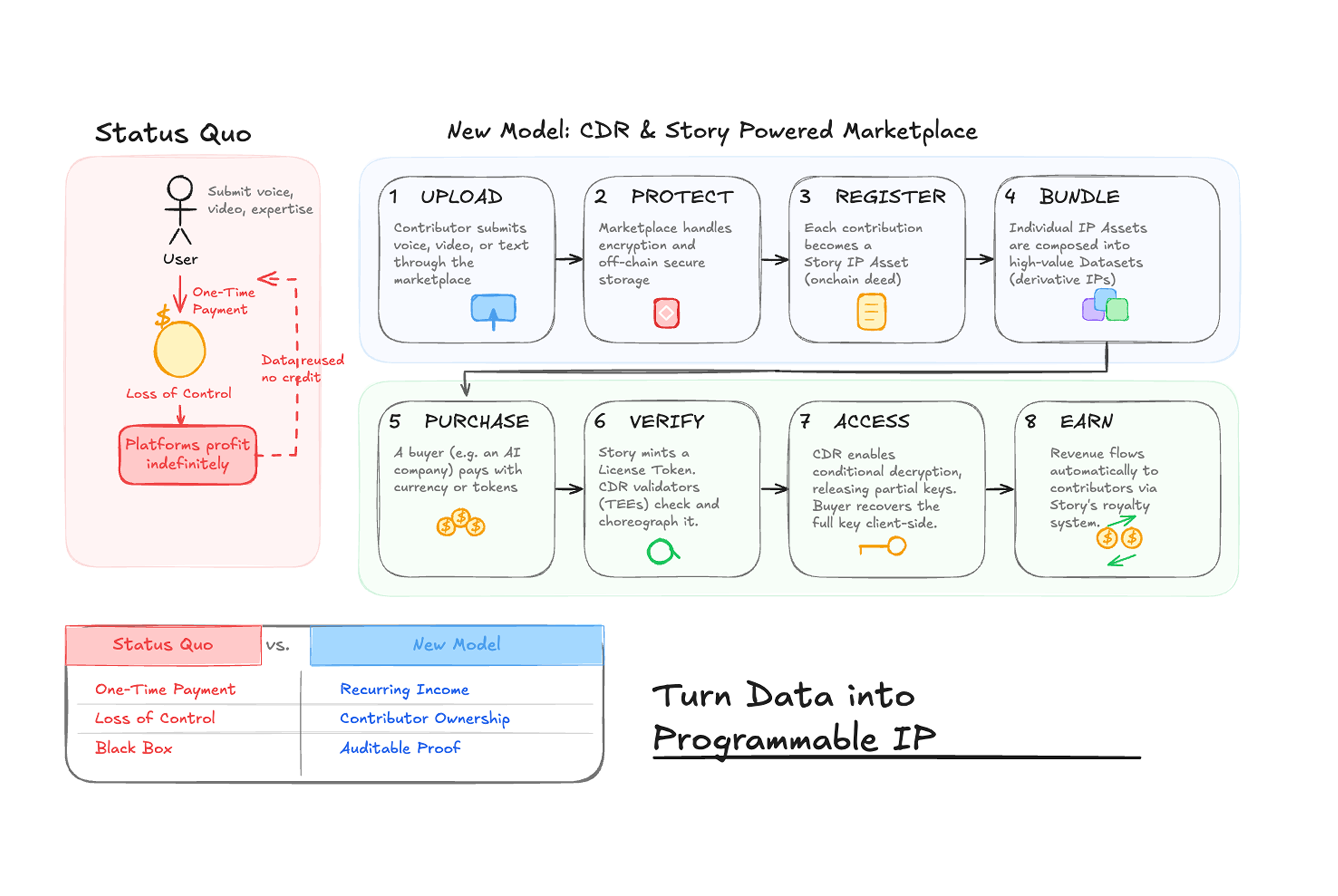 When a buyer purchases a dataset, they receive a license through Story. CDR verifies the license and enables the buyer to decrypt the data. Revenue flows back to every contributor whose data is included, automatically, through Story's royalty system.