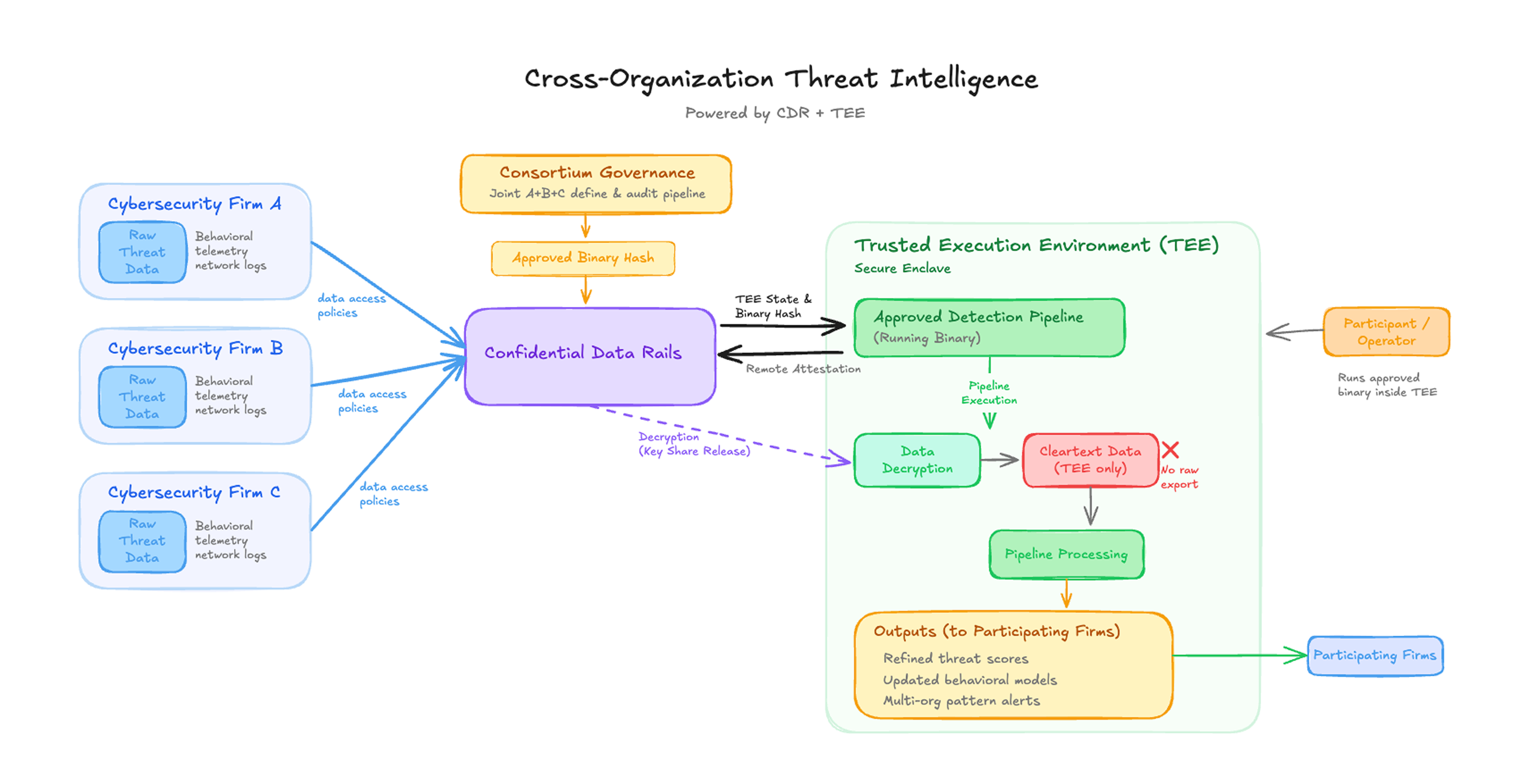 Approved code runs inside a verifiable execution environment, allowing organizations to collaborate on deeper threat data without sharing raw logs directly.
